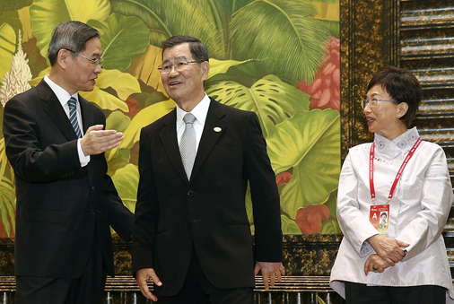 4月7日,國臺辦招待酒會在海南博鰲舉行,圖為國務院臺辦主任張志軍(左)歡迎臺灣兩岸共同市場基金會榮譽董事長蕭萬長夫婦參加酒會。中新社發 張浩 攝
