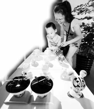 今年8月,兩岸青年文創精品展在福州開幕。圖為“臺灣新設計”展區內的臺灣創意瓷器吸引了一對母子的眼球。 劉可耕攝(中新社發)