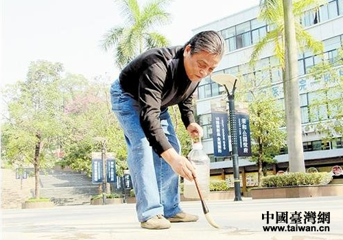中國(guó)臺(tái)灣網(wǎng)12月16日南寧消息 聽(tīng)臺(tái)聯(lián)的同志說(shuō),家住的南寧榮和山水美地的臺(tái)胞羅承鵬是位很有造詣的水墨書(shū)法愛(ài)家,常在小區(qū)空地、廣場(chǎng)清晨、傍晚用“地上書(shū)法”,引導(dǎo)青少年來(lái)傳承中華文化,受到各界的好評(píng)。