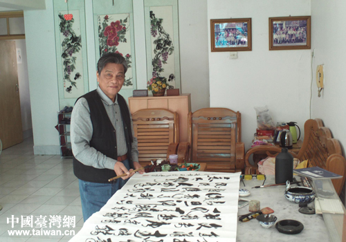 臺(tái)胞羅承鵬在家揮毫。(圖片來(lái)源:廣西臺(tái)辦)