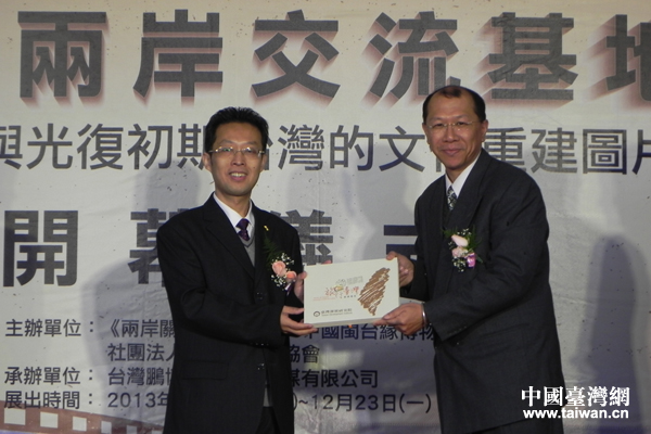 《兩岸關系》雜志社副社長鐘河林與臺南市文化協會顧問張先鵬互換禮品。(劉麗華攝)