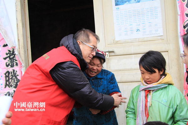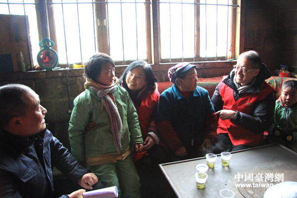 頂新公益基金會理事長滕鴻年(右一)帶隊到留守兒童家中慰問(中國臺灣網 李徽 攝)