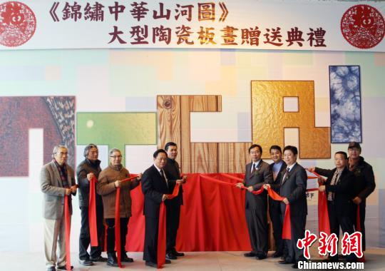 為充分展示當代陶瓷技藝,由著名瓷都景德鎮將《錦秀中華山河圖》燒制成大型陶瓷版畫,規格為2.6米乘以1.2米,是迄今大陸陶瓷燒制藝術頂峰的最佳表現——最大規格。陶瓷版畫《錦繡中華山河圖》共兩塊,一塊由大陸方面留存,另一塊當天贈送給臺灣工藝研究中心惠存。