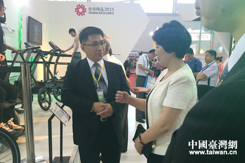 “臺灣精品館”中,展商介紹產品詳情。(中國臺灣網 張潔 攝)