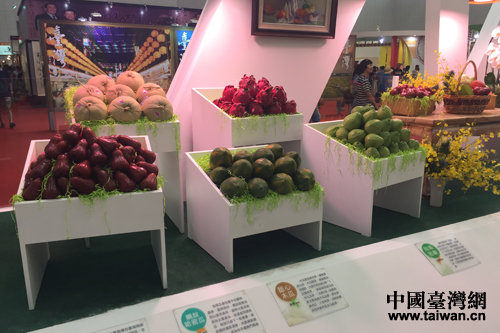 “臺灣農業精品館”中琳瑯滿目的臺灣特色水果。(中國臺灣網 張潔 攝)