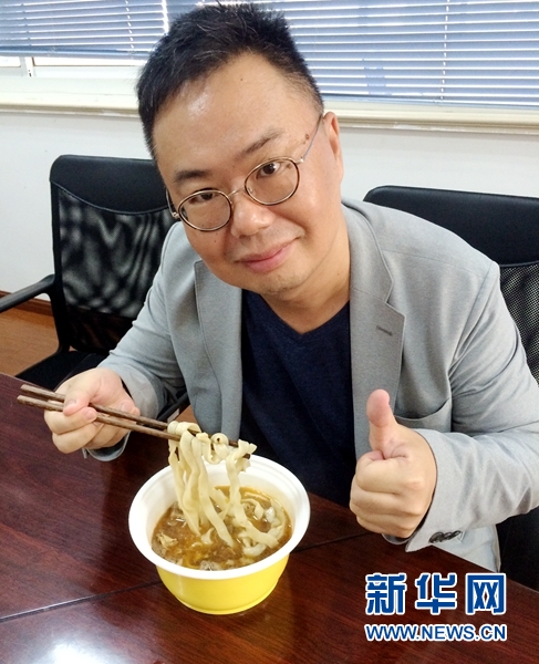 鹵豆創始人之一彭思舟在品嘗自動煮販機中煮出的面條 潘清攝