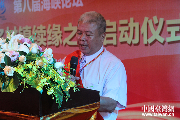 “第八屆海峽論壇 閩臺同名村鎮續緣之旅”啟動儀式上,來自臺灣新竹縣寶山鄉雙溪村的村長許秋天發言。(中國臺灣網 蕪同 攝)
