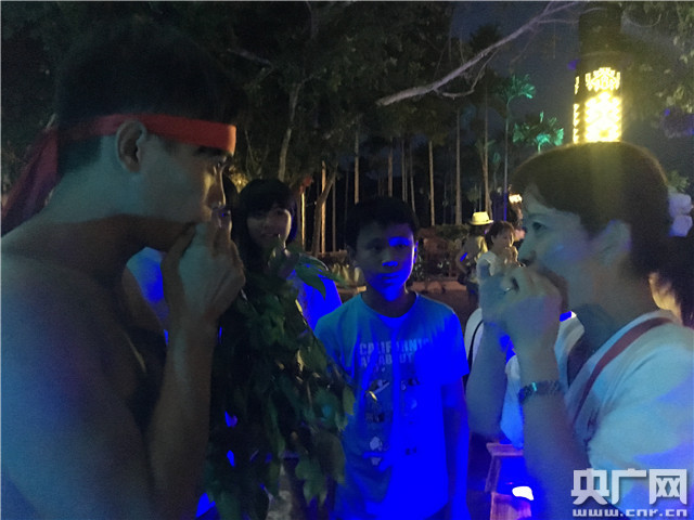 黎族阿哥交臺灣鄉親吹葉笛。(央廣網記者 李展鴻 攝)