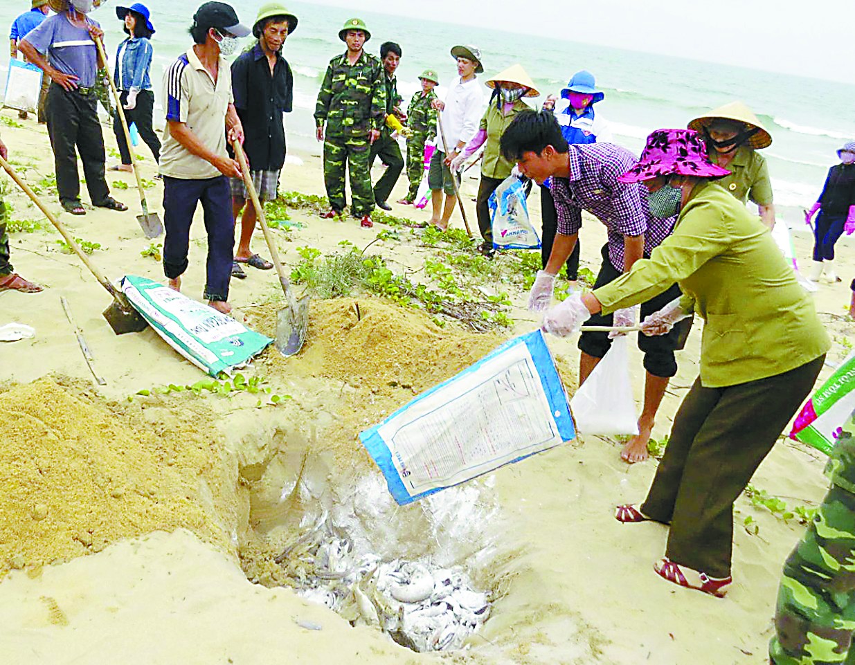 4月,越南漁民在海灘上掩埋死魚。臺塑集團在當地投資的河靜大煉鋼廠被指制造了污染。
