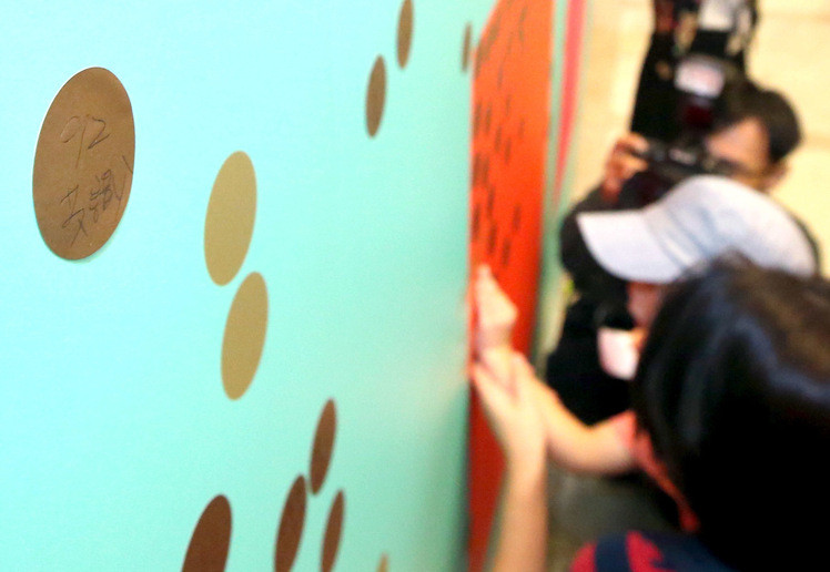 據臺灣《聯合報》報道,520政黨輪替后,蔡英文辦公室首次開放參觀,今日(18日)一早就有許多民眾排隊等候。據悉,現場安排民眾在背板貼上祝福的金色貼紙,有陸客寫上“九二共識”表祝福。