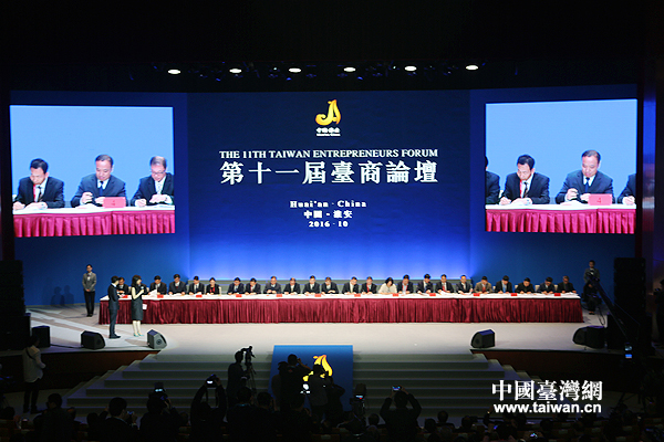 中國臺灣網10月19日淮安訊 (記者 王思羽)自2006年起,每逢金秋時節,海峽兩岸官產學研精英總如走親訪友一般,聚首江蘇淮安,為兩岸發展、經貿合作凝聚智慧,貢獻心力。今天上午,以“共創臺企升級新十年 鑄就臺商服務新示范”為主題的第十一屆臺商論壇在淮安舉行。今年有包括兩岸高層、知名學者、企業巨子、商界領袖在內的近700人齊聚淮安,持續推進兩岸發展大計。論壇現場簽約項目36個,總投資18.9億美元。