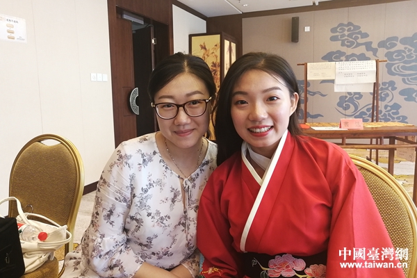實習生杜旻蓉(右)與書法指導老師朱文劍(左)。(中國臺灣網 張露露 攝)