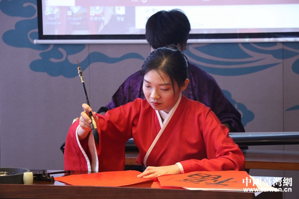 杜旻蓉在展示書法。(中國臺灣網 張露露 攝)