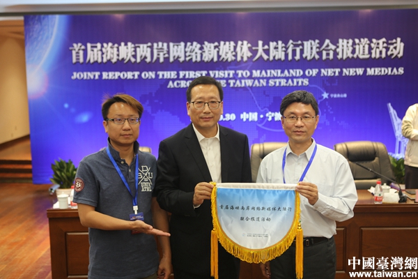 寧波舟山港董事會秘書蔣偉與兩岸記者代表合影。(中國臺灣網 陳佳慧 攝)