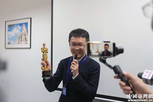 寧波諾丁漢大學臺灣講師林岳龍展示自己獲得的優秀教師獎。(中國臺灣網 陳佳慧 攝)