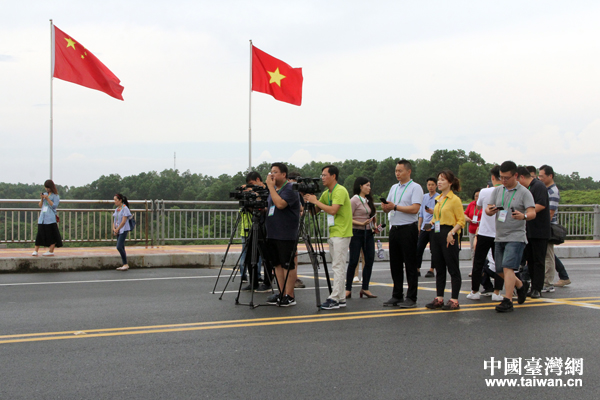 兩岸媒體人在廣西東興口岸北侖河大橋上的中越分界線上拍攝。(中國臺灣網 王怡然 攝)