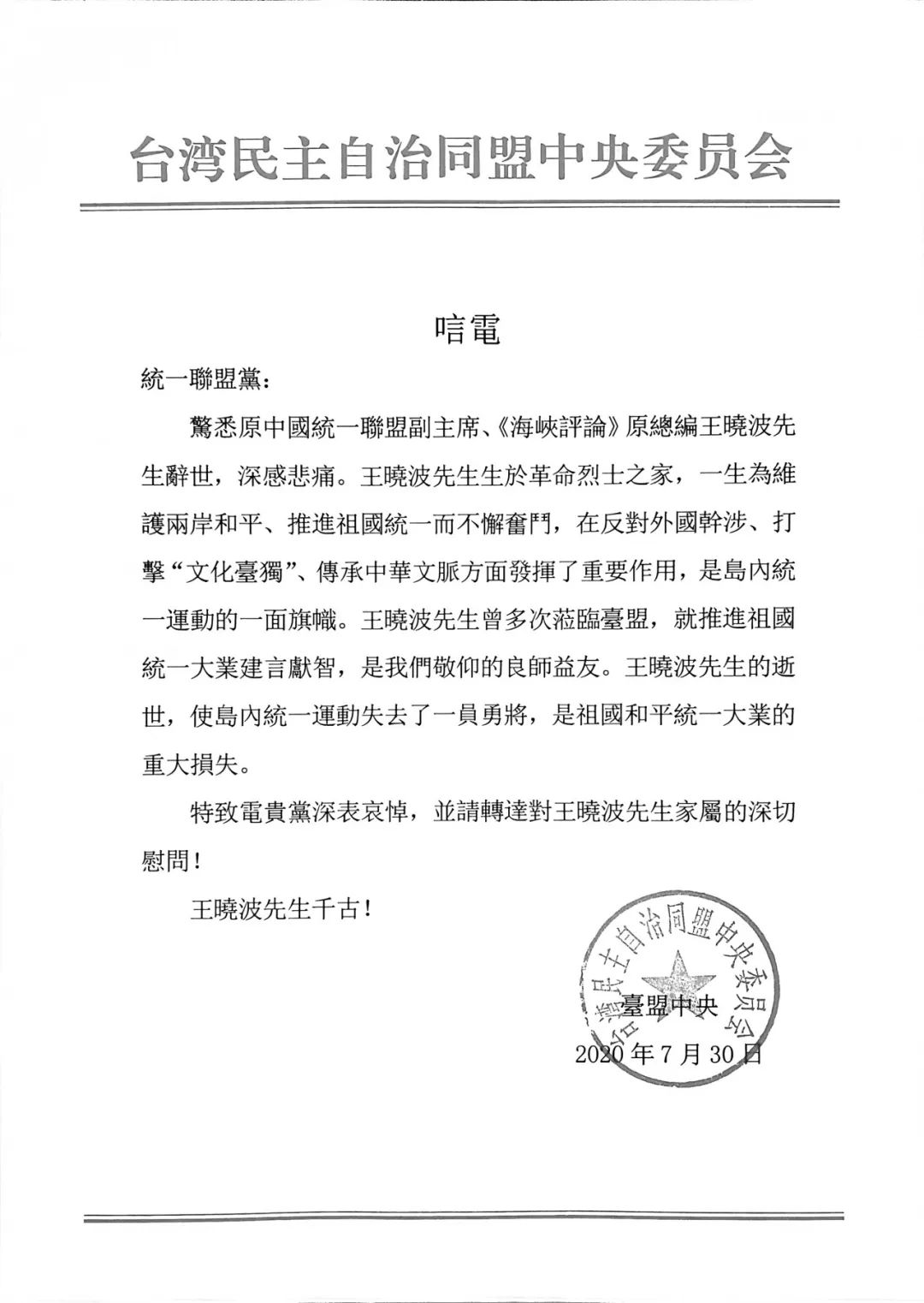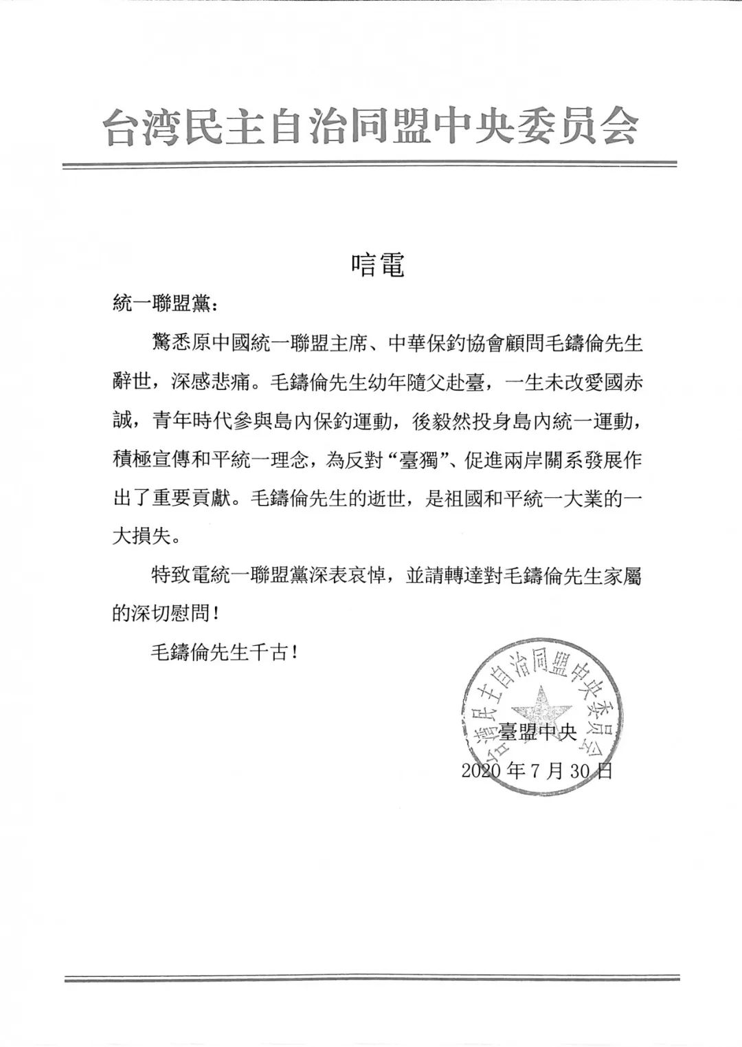 毛鑄倫先生、王曉波先生去世后,臺盟中央及時聯系統一聯盟黨主席紀欣了解有關情況,對毛鑄倫前主席、王曉波副主席的逝世致以沉痛哀悼,并請紀欣主席轉達對逝者家屬的深切慰問。