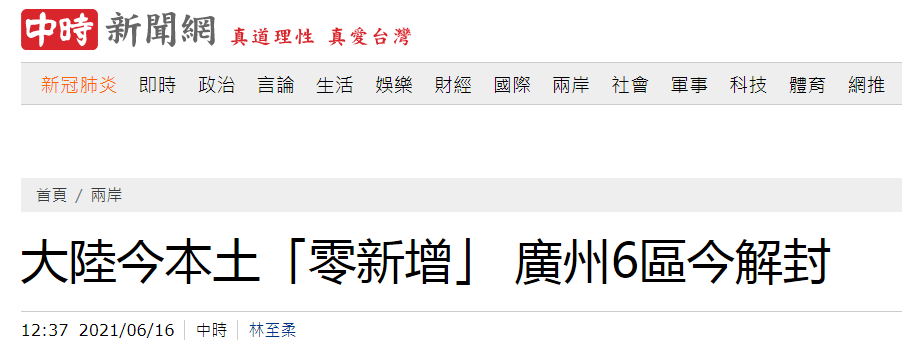 臺灣中時新聞網稱,大陸16日新增21例確診,均為境外輸入病例,本土“零新增”。廣州近日本土疫情嚴重,所幸15日并無再新增本土確診病例或無癥狀感染者。此外,廣州全市有6個封閉封控區域達到解封條件,并提出解封申請,經專家評估,已獲廣州市防控指揮部同意。