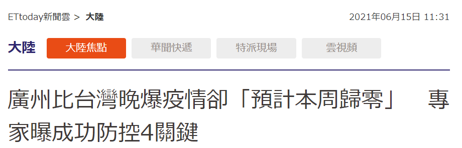臺灣“ETtoday新聞云注意到,廣州比臺灣晚暴發疫情,但可望在本月20日前清零。至于原因,報道提到了廣東省疾控中心首席專家馬文軍講到的廣州成功防控的關鍵。