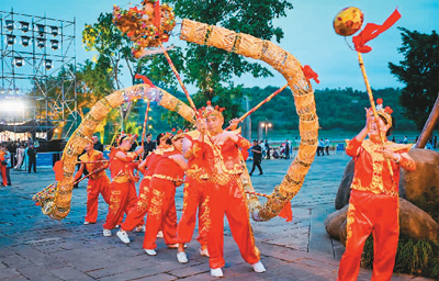 在四川宜賓,演員在“三江映明月 天涯共此時”海峽兩岸中秋音樂晚會上舞草龍迎佳節(jié)。