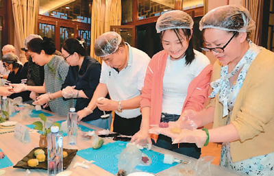 “清泉邀月明 碧荷融桃實(shí)”兩岸山東鄉(xiāng)親中秋聯(lián)誼會上,臺胞臺屬相聚一堂,體驗(yàn)月餅制作。