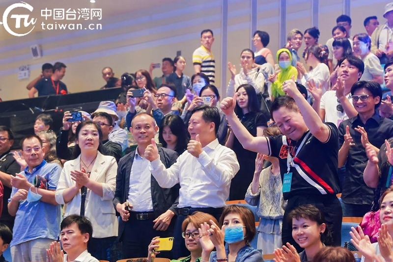 兩岸文旅界人士在觀看文藝演出《黎族家園》后為演藝人員喝彩點贊。(中國臺灣網發)