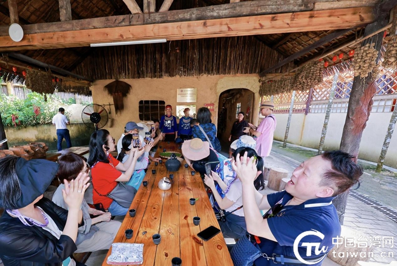 兩岸文旅界人士在考察海南檳郎谷黎苗文化旅游區時,與黎族非遺傳承人交流互動。(中國臺灣網發)