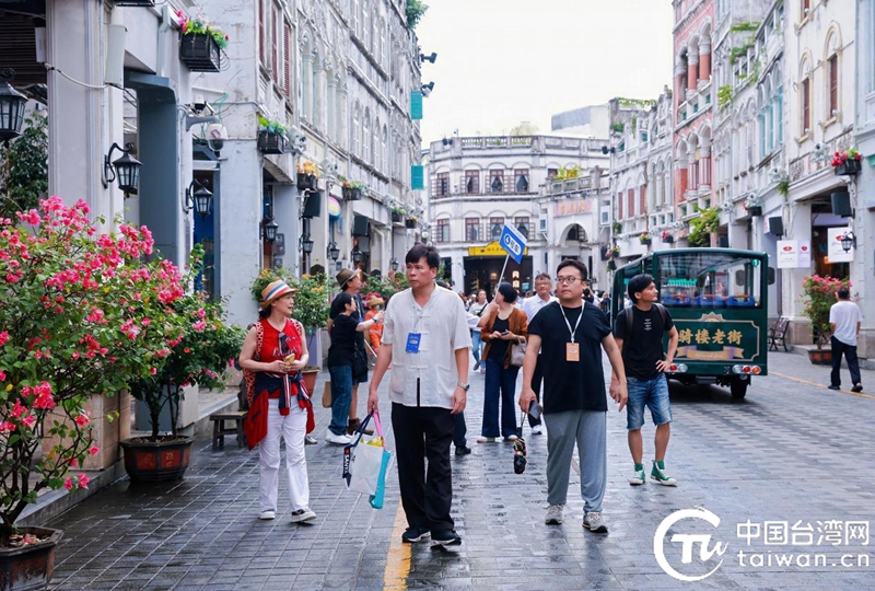 漫步海口騎樓老街,兩岸文旅界人士在極具南洋風情的歷史文化街區了解海口百年商業發展史、感受海口生活中的煙火氣。(中國臺灣網發)