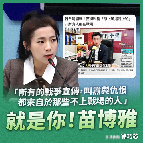 退役將領栗正杰也質疑,戰時第一線多為后備軍人,他們來自民間,“30歲以下的老百姓,就是未來第一線守備部隊”。他直言,戰爭影響的不只是軍事層面,連能源、電力、水源都可能全面中斷,“連上廁所沖水的水都沒有”,還怎么正常上班上學?“苗博雅是不是跟于北辰學軍事?才會講出這種驚世駭俗的戰爭論?”