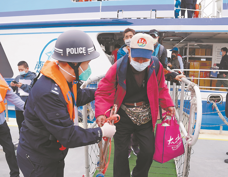 圖為福州邊檢站工作人員幫助行動不便的臺胞下船。(圖片來源:福建日報)