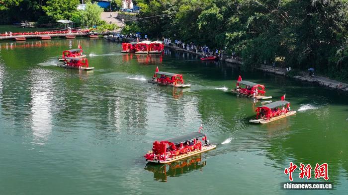 農(nóng)歷七月初七是中國傳統(tǒng)七夕節(jié)。8月30日,在中國最年輕的瑤族自治縣——廣西桂林市恭城瑤族自治縣茶江河上,一場主題為“瑤韻七夕·情定瑤鄉(xiāng)”的水上婚禮上演。當(dāng)天,一支身著瑤族盛裝服飾的迎親隊(duì)伍,抬著花轎、挑著嫁妝,在熱鬧的嗩吶鑼鼓聲中,走過街巷,登上張燈結(jié)彩的喜船沿江而下,進(jìn)行水上婚禮巡游展示。