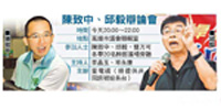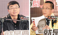 | “爆料天王”邱毅與“復仇王子”陳致中昨(13日)晚在壹電視《就是要問》節目中火爆對話!邱毅緊咬陳水扁家海外資金,質問“到底什么時候要將錢還臺灣人民”,陳致中則反擊“宇昌案”是烏龍爆料,要求邱毅向民眾道歉。邱毅直說這場辯論是“俠客對嫖客” |