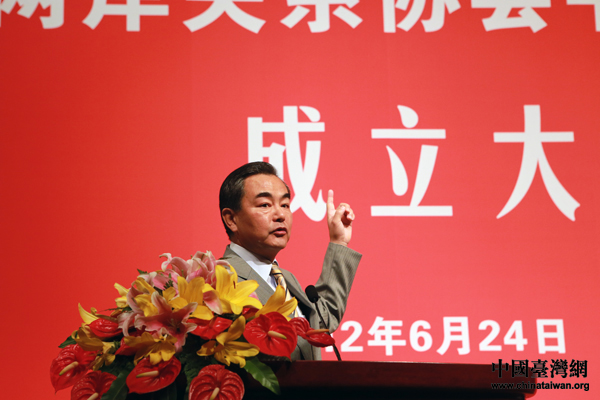 6月24日上午,海峽兩岸關系協會書畫交流分會成立大會在北京釣魚臺國賓館舉行。圖為中共中央臺辦、國務院臺辦主任王毅在成立大會上致辭。(中國臺灣網 于斯文 攝)