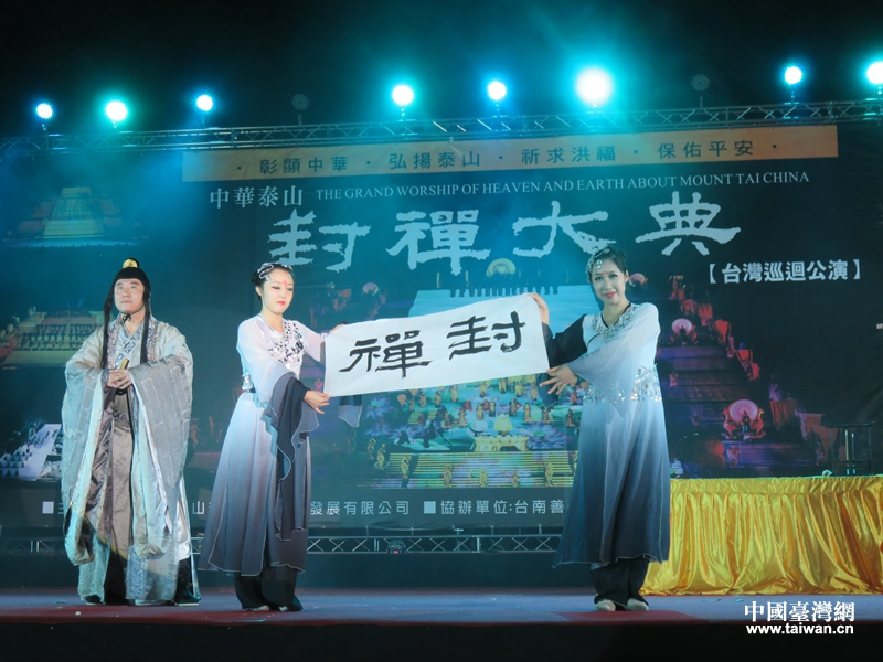 2015年1月,應臺灣文化產經交流促進會的邀請,由市臺辦、泰山景區管委會組織的中華泰山封禪大典赴臺文化藝術交流團一行21人,前往臺灣屏東縣新園鄉、臺南市善化區、高雄市岡山區、宜蘭縣4縣市,進行了為期8天,行程2000余公里的巡演活動,共舉辦泰山封禪大典祈福表演4場。演出現場人頭攢動,座無虛席。據統計,累計觀演人數達1萬余人,活動取得圓滿成功。