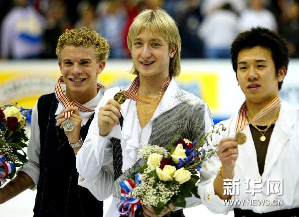 圖為獲得在美國(guó)華盛頓舉行的花樣滑冰世錦賽男子單人滑冠軍的普魯申科(中)在頒獎(jiǎng)儀式上(2003年3月27日攝)。 新華社發(fā)