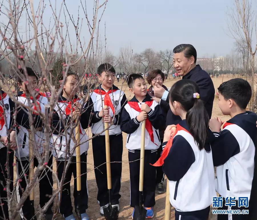 2017年3月29日,黨和國家領導人習近平、張德江、俞正聲、劉云山、王岐山、張高麗等來到北京市朝陽區將臺鄉參加首都義務植樹活動。這是習近平同參加植樹的少先隊員交談。