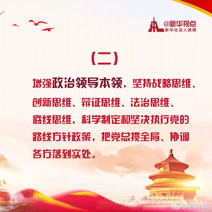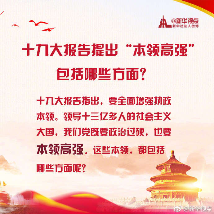新華網(wǎng)北京10月19日電 十九大報(bào)告提出,領(lǐng)導(dǎo)十三億多人的社會(huì)主義大國(guó),既要政治過硬,也要本領(lǐng)高強(qiáng)。全面增強(qiáng)執(zhí)政本領(lǐng),方法都在這里!(據(jù)新華社“新華視點(diǎn)”微博)