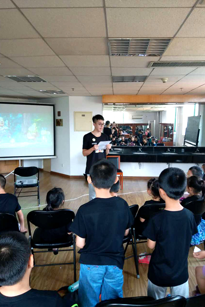 臺(tái)灣學(xué)生呂雨樵在為小朋友講解注意事項(xiàng)。