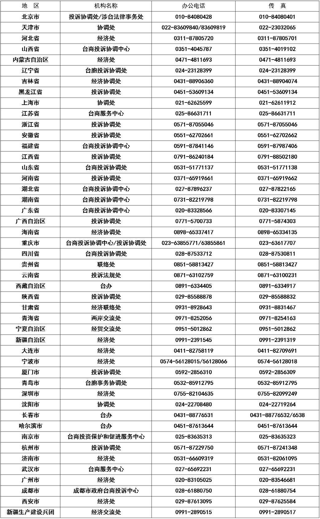 各省、自治區、直轄市及部分副省級以上城市臺胞權益保障機構及聯系方式