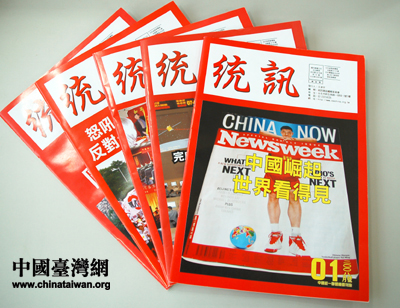 王津平向中國臺灣網記者贈送的中國統一聯盟機關刊物《統訊》 |