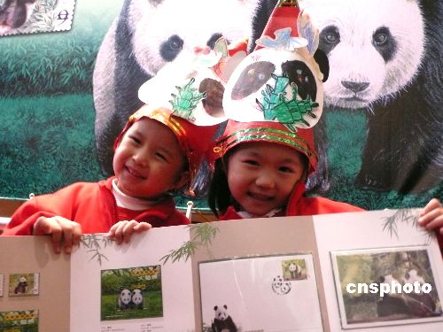 1月20日,為慶祝大陸贈臺兩只大熊貓“團團”“圓圓”到臺灣落戶,臺灣“中華郵政”舉行“可愛動物郵票——大熊貓”郵票及郵折發行典禮。本次發行的大熊貓郵票一組含郵票兩枚及小型張一張,分別為大熊貓團團(面值新臺幣五元)、圓圓(面值九元)和團團圓圓小型張(面值二十五元),各發行一百萬張!翱蓯蹌游镟]票——大熊貓”郵折一本,內含上述大熊貓郵票一組、小型張樣張一張、貼有團團郵票的首日封及原圖明信片一組三張,每本售價新臺幣一百八十元,限量二萬五千套。圖為臺灣小朋友扮成大熊貓模樣展示郵折。 中新社發 路梅 攝