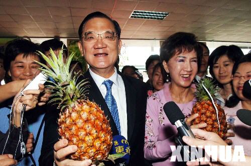 2006年4月20日,中國(guó)國(guó)民黨榮譽(yù)主席連戰(zhàn)參觀廈門(mén)臺(tái)灣水果銷(xiāo)售集散中心。連戰(zhàn)夫婦稱(chēng)贊臺(tái)灣水果好吃,為臺(tái)灣水果做起“廣告”。新華社記者 王建華 攝