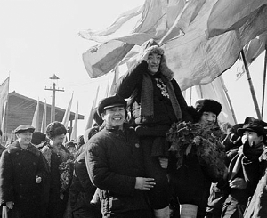 1954年,東北各地的工人和農民們在春節期間展開盛大的工農聯歡活動。圖為東北各省農業勞動模范參觀團到達遼寧省鞍山市時,受到工人們的熱烈歡迎。資料圖片