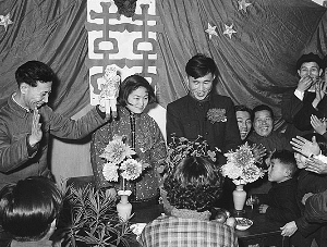 春節是結婚的好日子。這是1957年春節,遼寧省沈陽風動工具廠的工人鞠復海(新郎)和俞鳳仙(新娘)在婚禮儀式上接受朋友們的祝賀。資料圖片