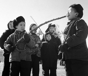 1961年春節,北京逛廠甸廟會的孩子們最感興趣的是大串糖葫蘆。資料圖片