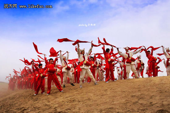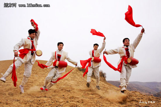 1984年,由陳凱歌導演、張藝謀擔任攝影的電影《黃土地》劇組走進了安塞縣拍攝腰鼓的鏡頭,150名身穿一色黑襖褲、頭扎白羊肚手巾、腰扎紅布帶的陜北漢子在朗朗晴空下,腳踏厚厚的黃土,齊齊地前進、后退、踢腿、轉身,只見黃塵滾滾,人影恍惚,震天的鼓聲和150條漢子的吼聲交織在一起,猶如黃河咆哮、萬馬奔騰。從此以后,這充滿民間生命力的安塞腰鼓便一發不可收拾地打出了黃土地。