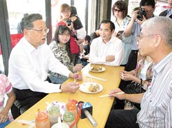 福建省長黃小晶(左一)在臺(tái)南市安平街區(qū)一家知名蝦卷店,邀請(qǐng)臺(tái)灣民眾一起享用美味的點(diǎn)心。圖片來源:臺(tái)灣《中國時(shí)報(bào)》