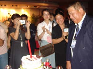 昨天晚上,正當(dāng)所有記者們還在按部就班、忙碌地采訪寧波市委為基隆訪問(wèn)團(tuán)舉行的中秋酒會(huì)之際,寧波市負(fù)責(zé)接待的工作人員忽然宣布,請(qǐng)所有來(lái)賓注意,今天正好是基隆訪問(wèn)團(tuán)一位成員的生日,5分鐘后,臺(tái)辦將為其送上生日蛋糕,表達(dá)祝福。這一下調(diào)動(dòng)了記者們的敏感神經(jīng),大家都在爭(zhēng)搶第一手資料,爭(zhēng)睹壽星寧波過(guò)生日的情景。