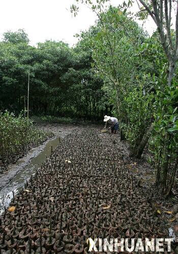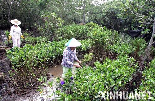 海南省海口市東寨港紅樹林國家級自然保護(hù)區(qū)的工作人員在培育紅樹林幼苗。 新華社記者丁林?jǐn)z