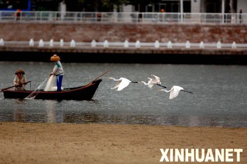 幾只大白鷺在海南省三亞市中心的三亞河上飛過。 新華社記者姜恩宇攝